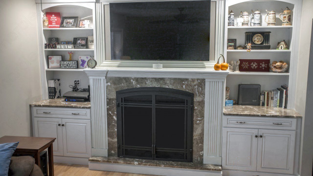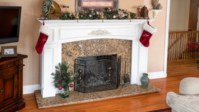 Save Photo Silver Pearl Granite Custom Fireplace Silver Pearl granite counter tops with a 1/4 Bevel Edge frames the fireplace and provides a gorgeous hearth. The white... Photos: 2