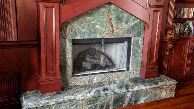 Save Photo Rain Forest Green Marble Fireplace Rain Forest Green marble transports us to the Amazon when we sit around the fireplace. Green, white, red and brown... Photos: 1