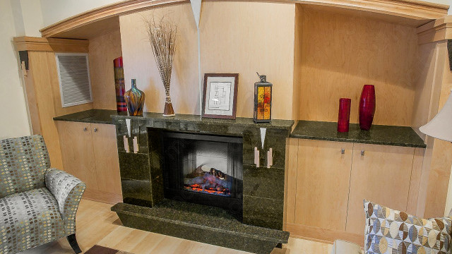 Save Photo Original Peacock Green Granite Fireplace This modern fireplace is a stunning addition to this room. The Peacock Green granite is a nice dark contrast to... Photos: 2