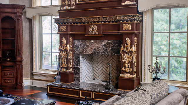 Save Photo Emperador Dark Marble Fireplace The gorgeous fireplace is the centerpiece of this living room. The large windows emphasize the elegance of the dark wood,... Photos: 4