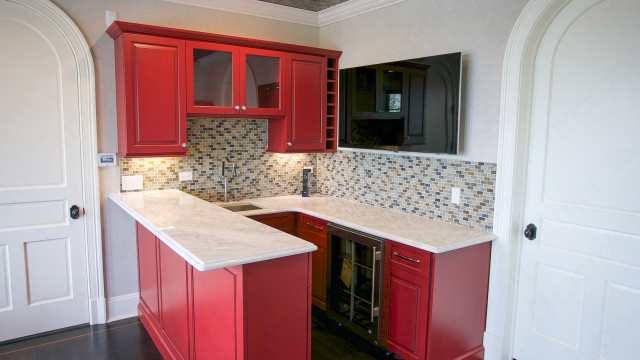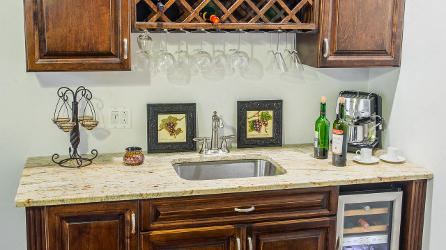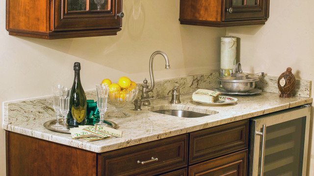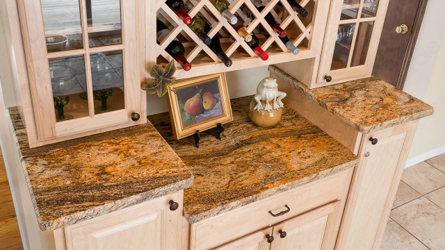 Save Photo Colonial Gold Granite Wine Bar Colonial Gold granite crowns this beautiful wine bar. Set off by the dark wood cabinets, the granite shines and adds... Photos: 1